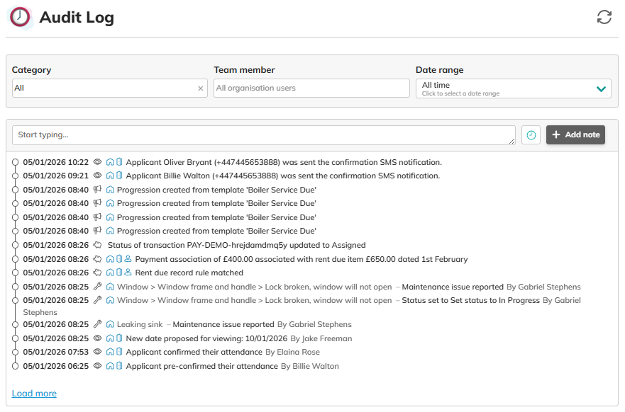 Here we can manually add notes to the history tab. They are date and time stamped with the user's name that added the note. You will also notice that when an action is completed, it will also log a record of this for you. For example, when a rent payment is logged, a tenancy agreement is signed etc.