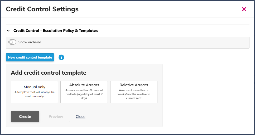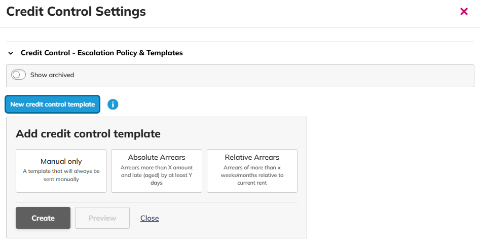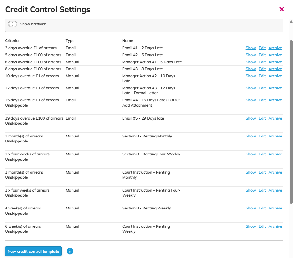The Credit Control panel allows you to create and store escalation policies and templates to send to your tenants.