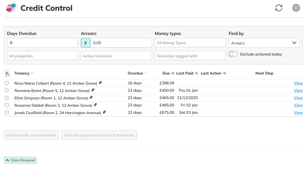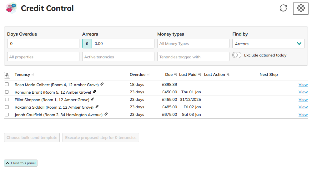 Here you will see any tenancy arrears. You can ‘Choose bulk send template’ or ‘Execute proposed step for (X) tenancies’.