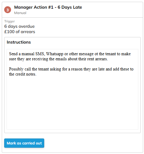 An escalation policy is a set of steps, emails and notifications that an organisation carries out depending on how late (how many days) and how large a tenant’s arrears are. Usually the policy is followed loosely with the credit control manager being given a lot of flexibility to agree repayment plans with tenants.