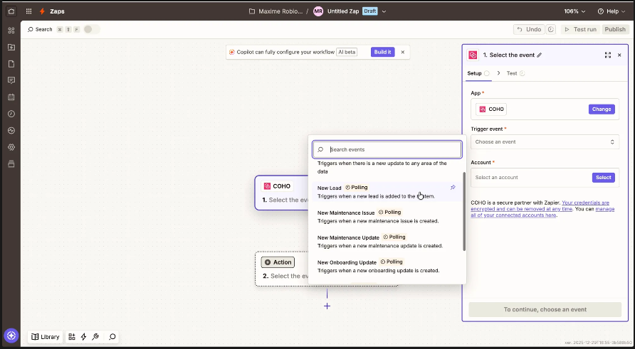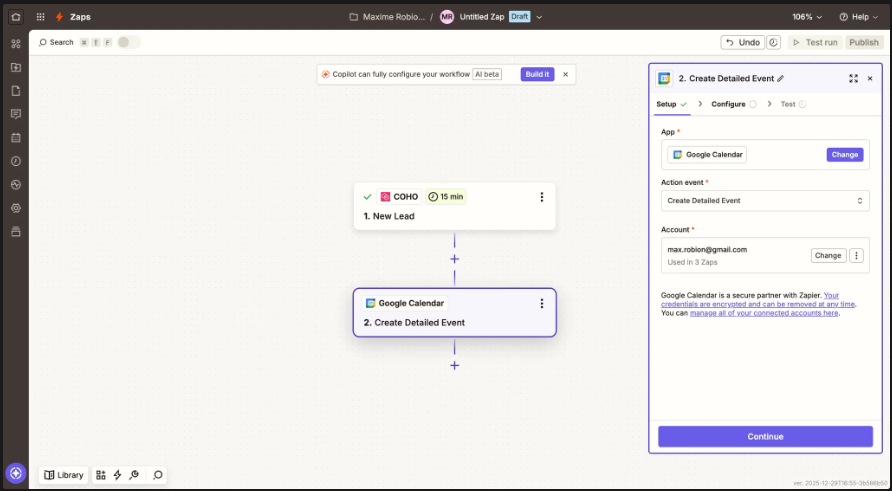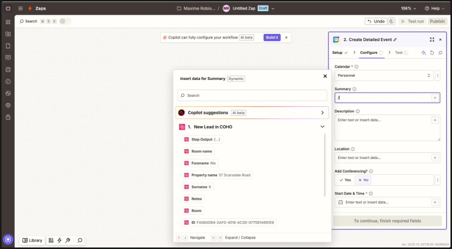 I can use the data from that new lead, to pass it into the new calendar event summary, or description…(use the / key for this) That explains the power of Zapier: catch things happening in COHO, and action them onto new apps!