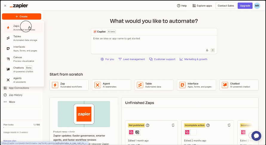 First, head to https://zapier.com. You might have to login or create an account. Once connected, click on “+ Create” and select “Zaps”