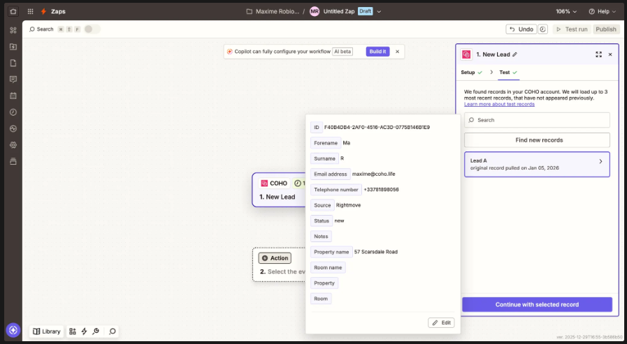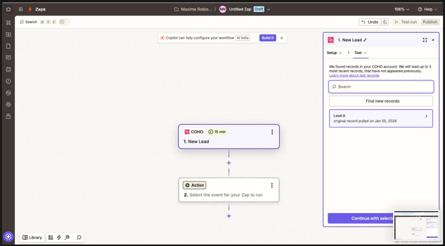 Once that’s done click on Continue. You’ll get to the Test section. What happens there is that Zapier will ask COHO if there are some records matching the triggers and return them. For instance on the screen below, Zapier found one lead record I could do my test with.