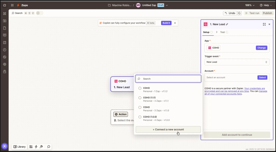 …and link your COHO account. If you don’t have a COHO account linked onto Zapier already, click “Connect a new account”.