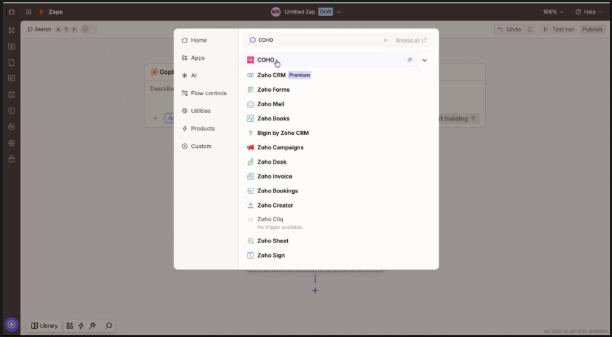 On the Zapier designer screen, first click “Trigger” and select COHO.