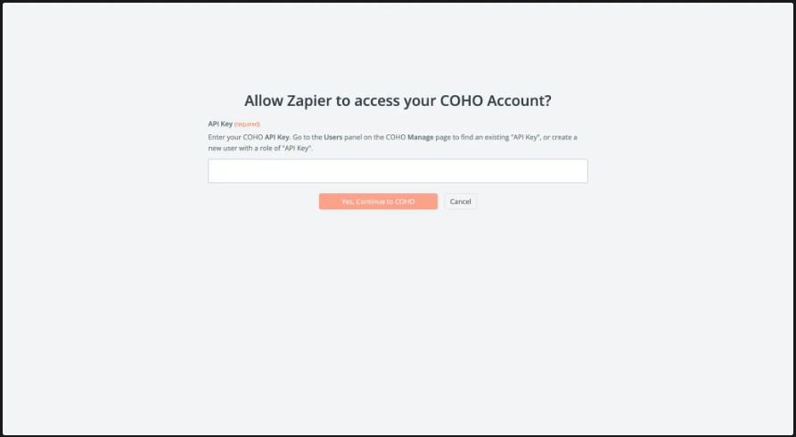 In the case you’re connecting your account, you’ll get to the screen below. There, paste the API key you created from COHO.
