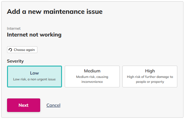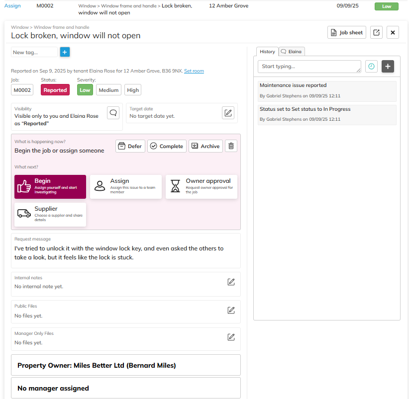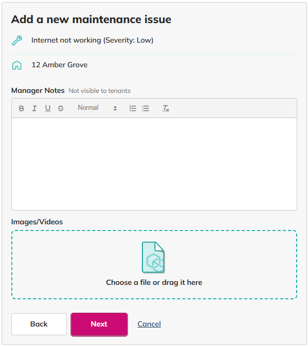 Internal notes: Internal notes can be added to the maintenance issue at any stage. Internal notes are not shared with the tenant(s).