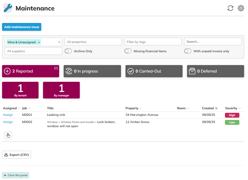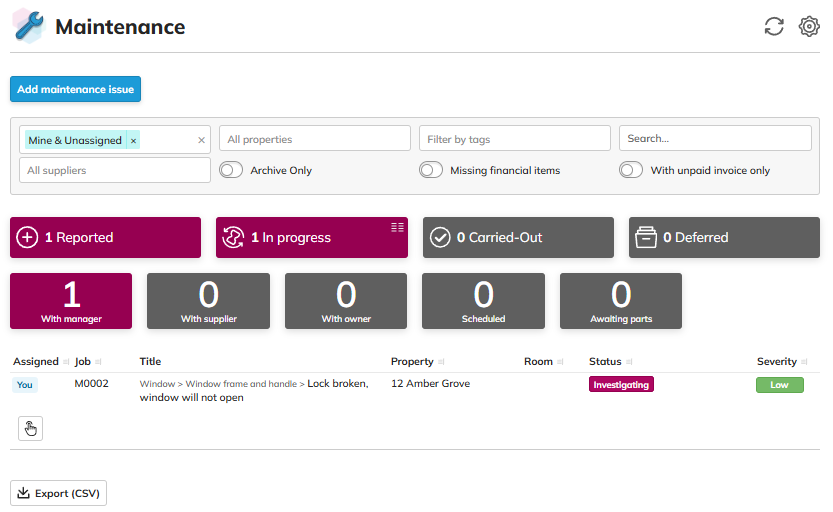 Once a maintenance issue has been raised by either the manager or a tenant, you will see the issue in the ‘Reported’ section.