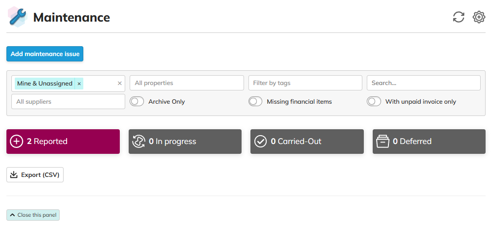 The Maintenance panel on COHO allows you to view all maintenance issues that have been reported and track them throughout the workflow. Both managers and tenants can report maintenance issues directly.