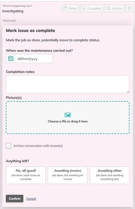 Click ‘Confirm’ to move the issue to ‘Carried out’ or ‘Cancel’.
