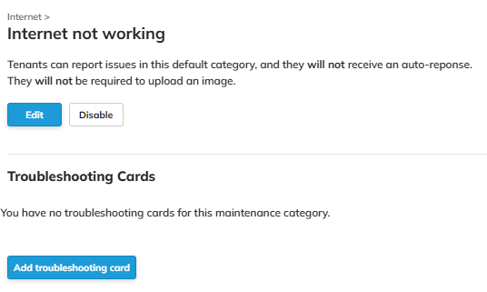 Maintenance Categories: Here you can set up auto response messages, request image uploads and add troubleshooting cards. See also Auto Response Messages.