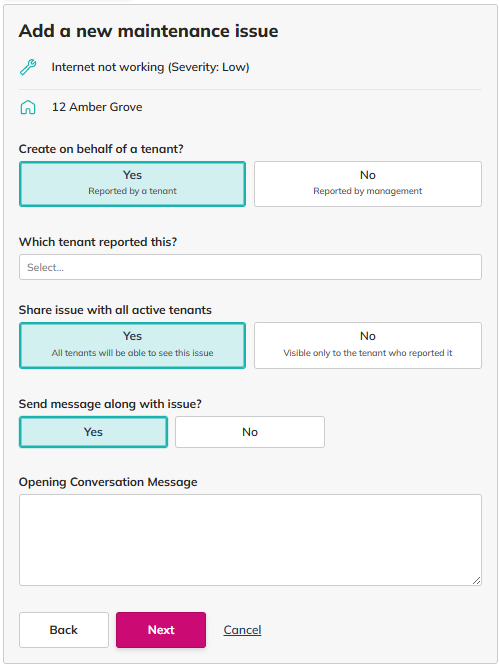 Yes: Allows you to add a message alongside the issue that tenants will be able to view on their My COHO dashboard.