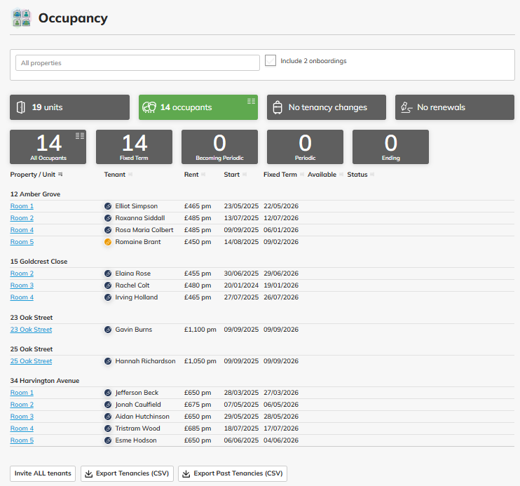 Occupants > All Occupants: Here you can view all properties, rooms, tenants names, rent amounts, start and fixed term end dates, availability and status.