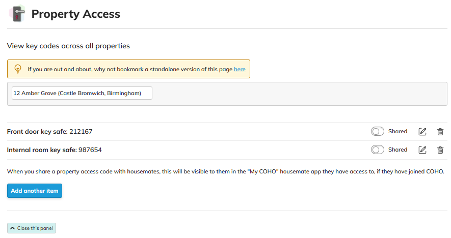Property Access panels in COHO allow you to store internal / external, door and key safe codes.