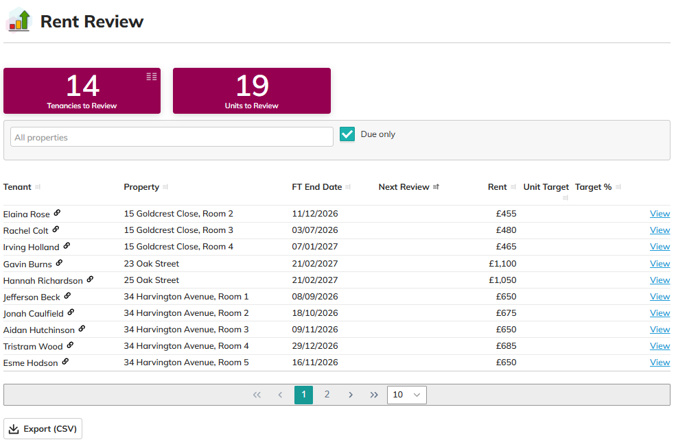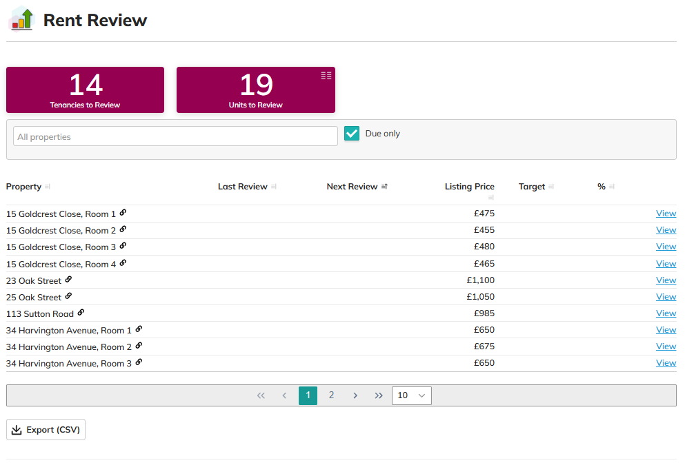 Important: This will update the target rent, allowing you to track what you could be getting. If as a result you decide to change the rent for an existing tenancy, you must do that separately. See also Tenancy Summary & Information. Minimum viable rent is currently for information only within this Rent Review section.
