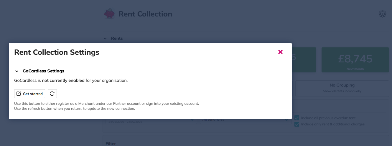 We have an integration with GoCardless. GoCardless allows for collecting one-off payments and/or automating recurring payments with Direct Debit without the stress of chasing rent payments. To configure your GoCardless account, click the settings cog in the top right hand corner of the Rent Collection panel.