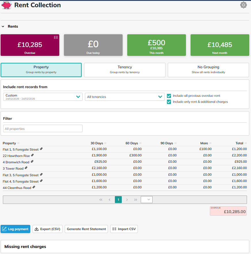 The Rent Collection panel on your main portfolio / organisation page allows you to see all rent due records in one place for all properties and all tenants.