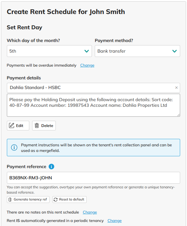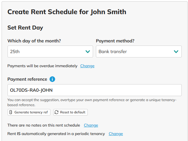 Payment reference: Payment references are important when reconciling rent whether you do this manually or using the COHO automated bank feeds. See also Transactions. We will by default suggest a unique payment reference for you to use for the tenancy. You can choose to use a different reference related to the tenancy, or you can type in your own payment reference.