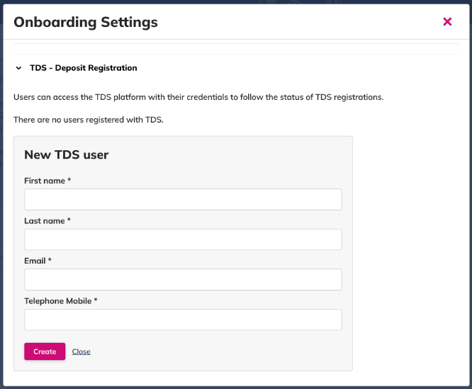- Make sure you have created a user to access that account on TDS platform. To do this, head to the onboarding panel on the manage page, then open the TDS Deposit Registration section and click on "Add user". It will open a form where you can add your email and submit.