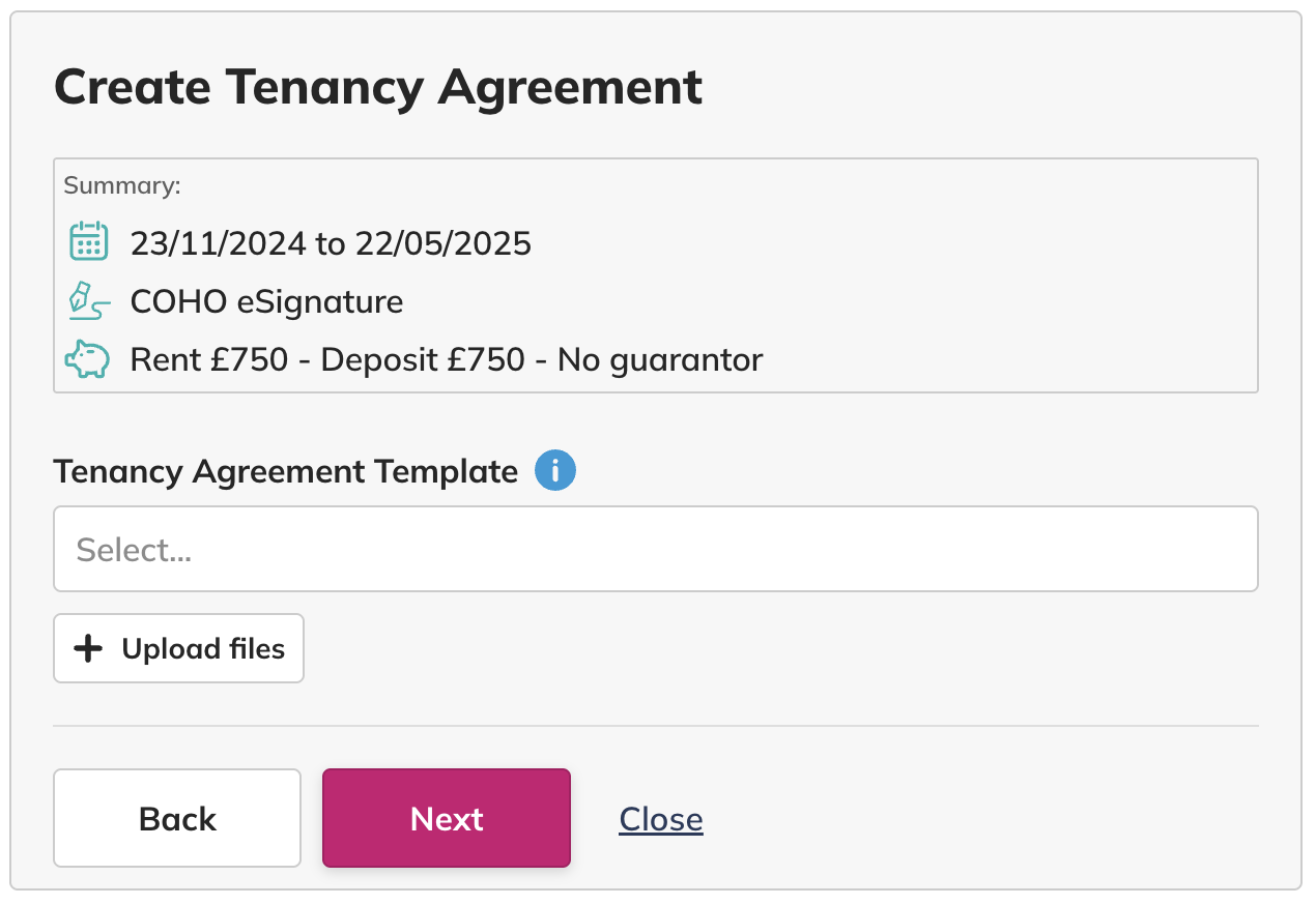 Once on the create tenancy agreement form, at the step where you upload the files, you will see a selector to use your template. If you don’t want to use a template, you can click “Upload files”.